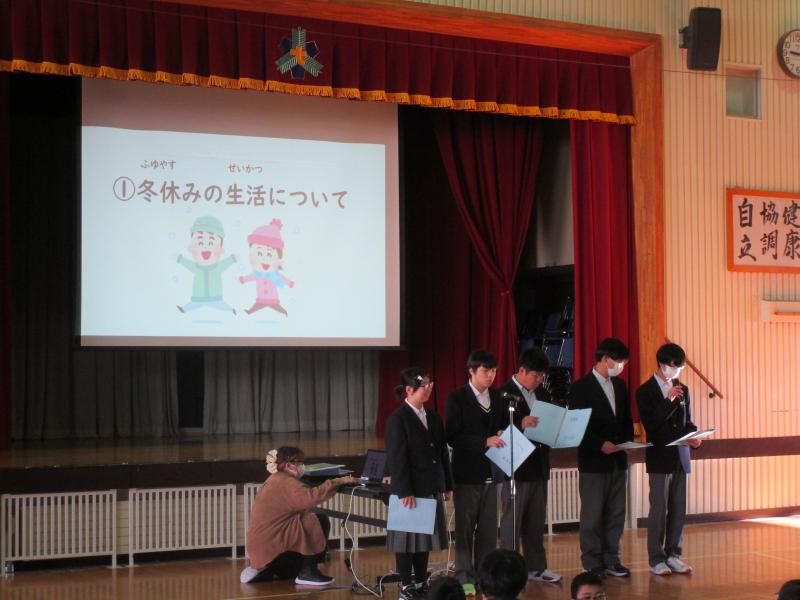 12月23日(火)全校朝会がありました。校長先生から、これまでの生活を振り返ってお話がありました。また、高等部3年中野さんから「あおもりアビリンピック」についての発表や、児童生徒会から冬休みの生活についての約束、表彰等がありました。校長先生や児童生徒会役員からの冬休みの約束等の話に耳を傾け、明日から始まる冬休みを楽しみにしているようでした。